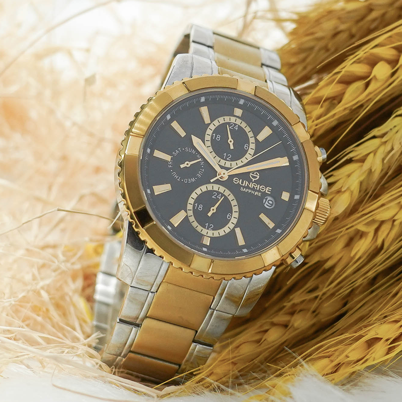 Đồng hồ nam 6 kim Sunrise DM762SWA sapphire bảo hành chính hãng. Thương hiệu đồng hồ đến từ đất nước mặt trời mọc Nhật Bản, với chất lượng ưu việt thiết kế thời trang thể thao nam tính mạnh mẽ sang trọng, với chất liệu thép không gỉ 316 cùng công nghệ mạ vàng giúp cho sản phẩm được bền màu, chất liệu kính sapphire chống xước cho mặt đồng hồ luôn sáng bóng