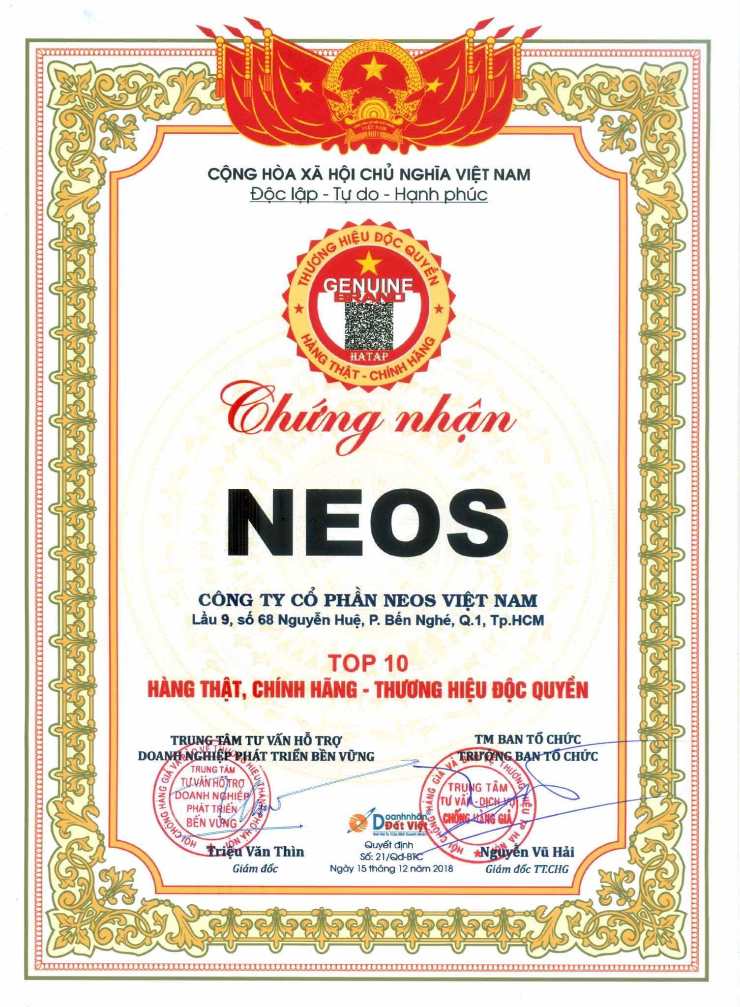 Vừa qua Neos Việt Nam được vinh dự được nhận danh hiệu TOP 10 thương hiệu ưa chuộng do người tiêu dùng bình chọn năm 2018. Đánh dấu một quá trình 10 năm cho việc Neos có mặt tại Việt Nam khẳng đinh chất lượng sản phẩm và dịch vụ hậu mãi của mình với người dùng Việt. Với tiêu chí "tư vấn tậm tình phục vụ tận tâm" Neos cam kết sẽ làm hài lòng người tiêu dùng hơn cả sự mong đợi.
