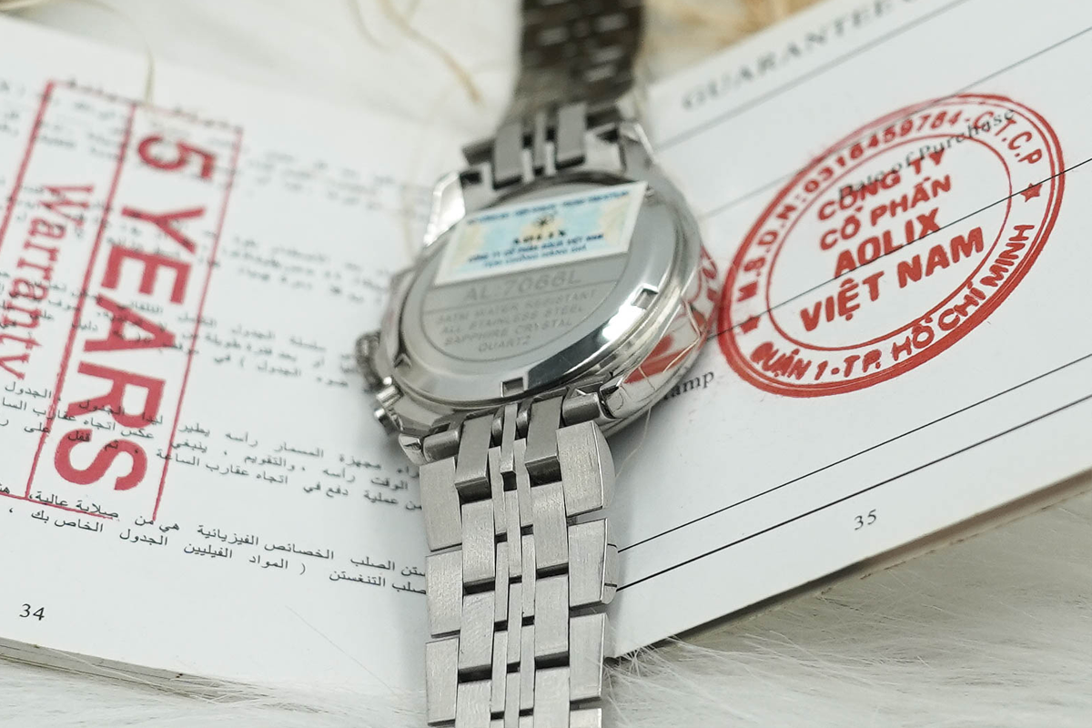 - Tem Chống Hàng Giả: Mỗi chiếc đồng hồ AOLIX chính hãng đều có tem chống hàng giả của Bộ Công an dưới nắp lưng.